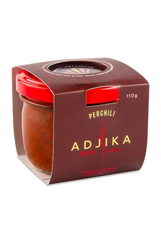 Красная аджика Perchili — традиционная аджика по классическому Абхазскому рецепту, обладающая ярким красным цветом благодаря использованию купажа сортов острых кавказский перцев. Это густая пастообразная приправа с насыщенным вкусом, который сочетает остроту перца, аромат чеснока и пряность местных трав. В её основе — свежемолотые специи, придающие блюду пикантную нотку. Аромат этой аджики невозможно спутать ни с чем другим: запах дроблённого перца смешивается с запахом пряной зелени и чеснока, создавая уникальный букет ароматов.